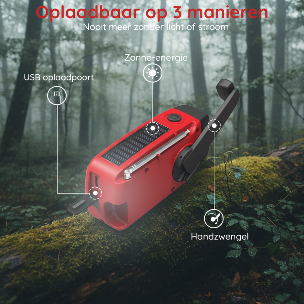 - Meerdere energieopties: werkt op zonne-energie, handzwendel en usb ingang